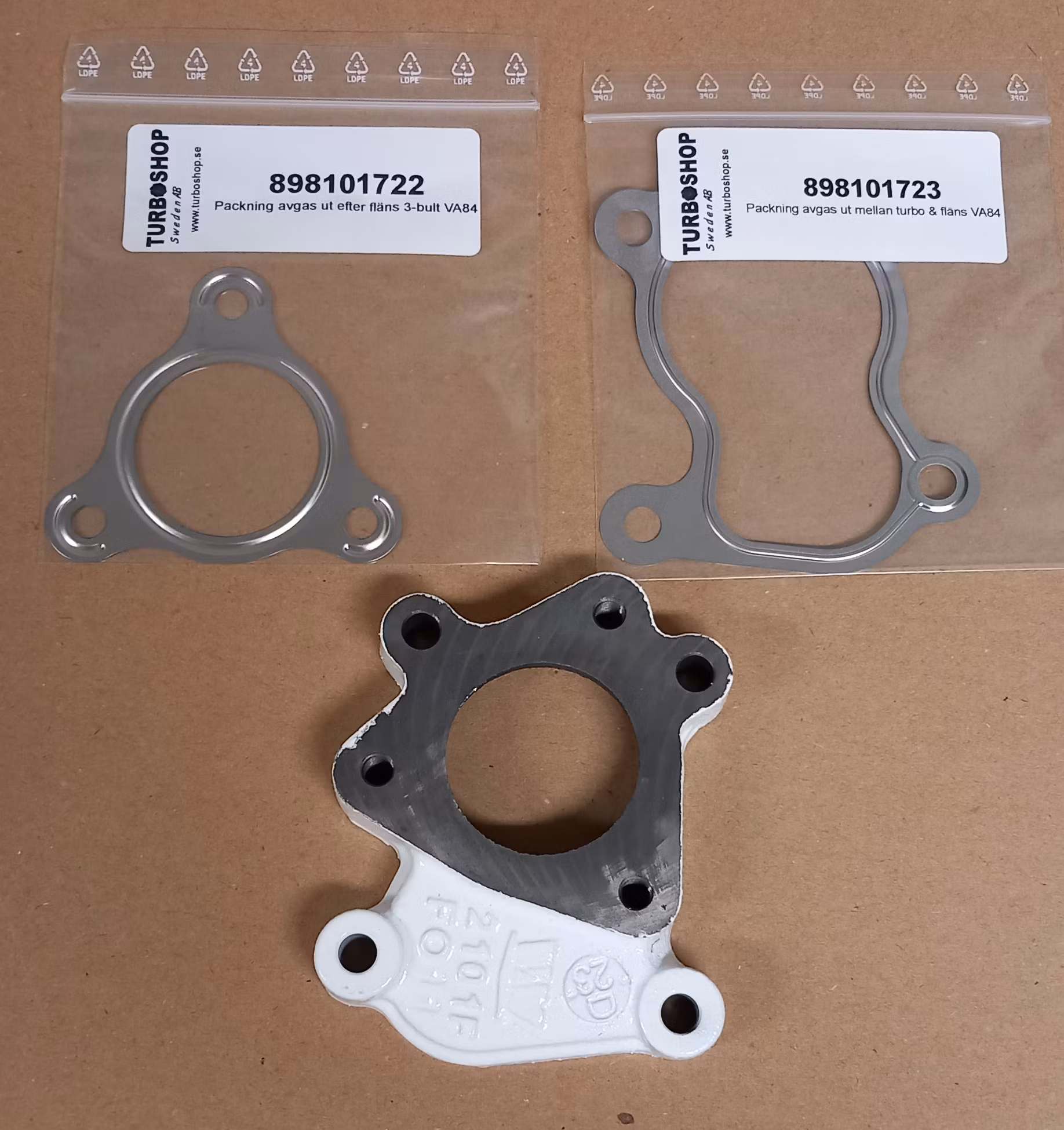 Avgas ut fläns med tillhörande packningar till IHI VA84Kit:1x 898101686 Fläns avgas ut1x 898101722 Packning avgas ut efter fläns 3-bult1x 898101723 Packning avg